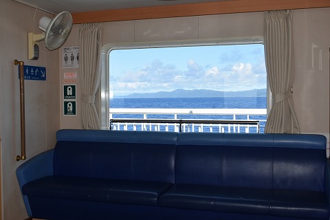 俺は船室内後部の優先席で、 センプーキを回しながら快適に過ごしていた。 乗船前は、空調のトラブルで冷房が効かないか 極く弱くしか効かないことがあると聞かされていたので ちょっと心配だったが、幸い冷房は効いていた。 写真は、西表島沖を航行中に撮影。 |