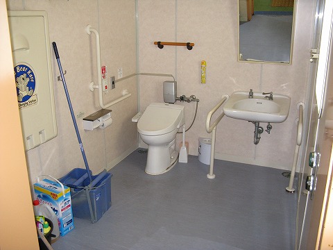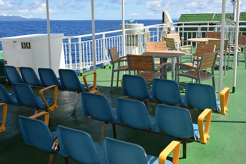 船尾の甲板の座席。 | 多目的トイレ。 掃除用具置き場を兼ねているようにも思える(笑)。 |