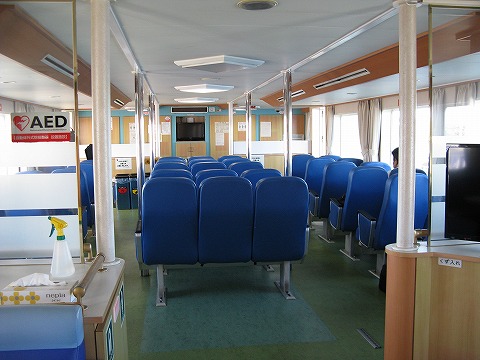 車両甲板 | 船室。 リニューアルされたようで、きれいだ。 客は俺を入れて7人か。 |