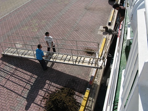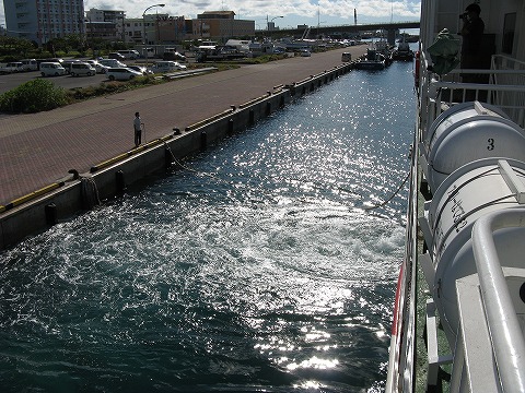 「フェリーはてるま2」。 199トンの小さな船。 小さいとはいえ離島ターミナルには入れないので、 ターミナルから港をぐるっと回った反対側のフェリー発着所で乗船する。 |