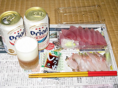 無事にマグロ(なにマグロかは知らない。)と イラブチャーの刺身を確保してきた。 刺身は冷蔵庫に入れずにレジ横に平積みにしていたんだけど、 大丈夫なのかね。 すぐにはけてしまうことが分かっててそうするんだろうけどさ。 他のお買い物もしたので、それぞれの値段は知らない。 レシートくれなかったし。 1パックが結構な量。 さて、いざ実食してみると…、 マグロは内地で食すのとさして変わらなかった。 特にマグロ好きというわけではではない俺にとっては、 せめて産地ならではのもっと歯ごたえのある肉質を 期待していただけに残念。 イラブチャーはシコシコと歯ごたえがあり、こちらはまーさん。 どーでもいーけど、しょうゆは俺が出張や旅用に いつも持って歩いているもの(笑)。 このあと、ちょっと単調な醤油味に飽きてきたので、 羽田で買ったお弁当に付いていたタルタルソースに変えたら またイケるのでした。 |
