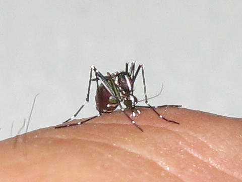 部屋にはどこかから蚊が入ってきて俺のことを刺しまくる。 血を吸うのは交尾を終えたメスのみだそうで、 「妊娠した女王様蚊にワタクシの血を吸っていただけるなんて 幸福至極でございますぅ〜!」 なんて感情にはならず、暑くてイライラしていることもあり、 この写真を撮影した数秒後に、 俺の血でハラが膨れているこの女王様蚊を殺害した(笑)。 鮮血が飛び散ったぜ(厚さでおかしくなってるな、俺。)。 |