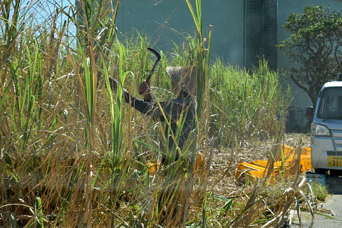 サトウキビを手作業で収穫していた。 ハーベスターが壊れたのかな。 暑いのでクルマの中から撮影。 |