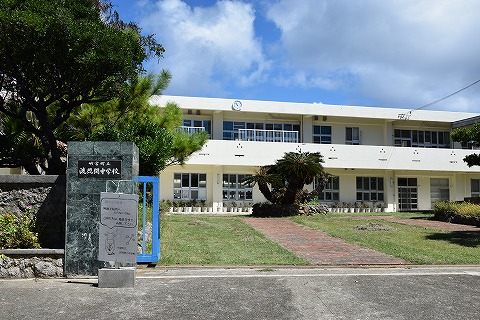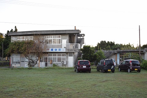波照間中学校。 →の写真と同じ建物。 入口の左右に銘板があり、左が中学校で右が小学校。 |