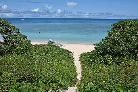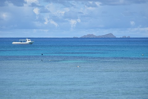 ニシ浜。 素晴らしい海の色。 ダイビングボートが停泊しているね。 海面の点々はシュノーケラー。 向こうの島は中御神島(なかのかみしま・なかのうがんじま、など。 文字は国土地理院に習った。)。 ダイビングポイントもあるようで、前から潜ってみたいと思っている。 |