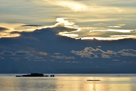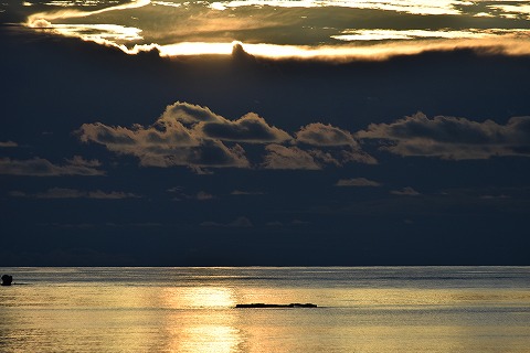 水平線より上は、手前の小さな浮雲の向こうで 厚い雲が覆っていた。 |