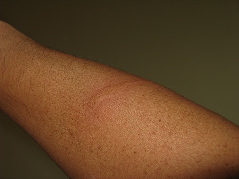 やっぱり暑くて6時半頃目が覚めた。 早速蚊が刺してきたので殺害したのだが、 蚊の針が腕に刺さったまま放っておいたらこんな細長く腫れてしまった。 かい〜の〜。 |