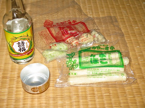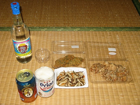 さて、今日の晩メシ。 夕方にまちぐゎで確保しておいた。 ・鯖の磯辺フライ的なもの ・スパイス鷄空的なもの(ちょっとしょっぱい) ・酢の物 をツマミに、オリオンでかりー。 ちなみに、お惣菜は全て波照間島内で作られたもの。 そして、オリオンが終わったら、「泡波」が控えているのだよ。 三合瓶の右に置いてある「ガラスのさかずき」的なものは、 昼間に飲んだポカリのペットボトルを裁縫セットに入っているはさみで切って 下部を活用したもの。グラスっぽいでしょ(笑)。 今晩は暑さに負けてエアコンを使っているので、 湿度の低い部屋で快適に呑める。 |