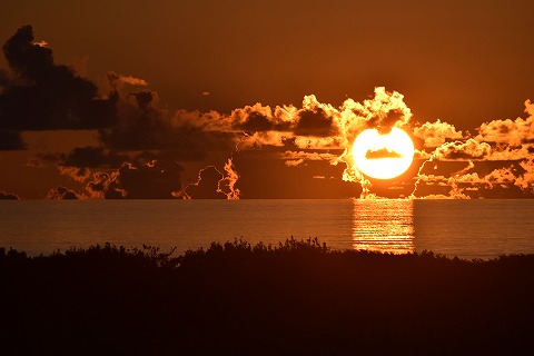 波照間島の東側は、海っ端にはなかなか簡単には出られないので、 少し高さを稼いでサトウキビ畑の脇道に来て撮影。 昨日の夕日はダメだったが、今日の朝日が見られたからよかった。 |
