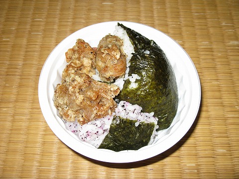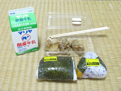宿に戻ってきた頃に7時になったので、 まちぐゎで朝メシ用におにポー200円ナリとしそおむすび100円ナリ をGETしてきた。これに、昨日の残りの鷄空を合わせて…。 |