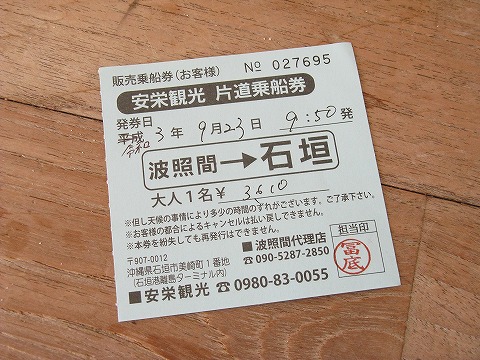 石垣行きのチケット。 | 高速船「ぱいかじ」のシート。 新幹線みたいだが、リクライニングはしない。 荒天の高波で船がバウンドすることもあるので、シートベルト付きですぜ。 あ、宿の共用冷蔵庫に水とオリオン缶を冷やしたまんま忘れてきた… (石垣島に着いたら宿に連絡して、テキトーに呑んでと伝えたよ。)。 さあ、石垣島に帰ろう。 波照間島にはまた潜りに来たいね。 続きの石垣島はこちら。 |