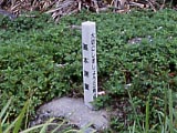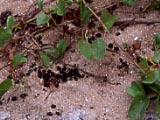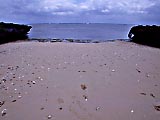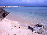 結構ガラス(マリングラスってんですか?)が落ちている。うかつに裸足で歩くのはアブナイよ。 | 外若浜の入口には大きなでいごの木がある。島仲浜から約4分。 | 外若浜の入口には、防潮林の標識が立っている。取材時にはなぜか漁網もひっかかっていたが、いつもあるとは限らないと思う。 | 外若浜は割ときれいなビーチ。でも、ガラスには気を付けて。 | うるせー、蝉。 | フナバル浜への分かれ道。左は一周道路の来た方向。右は浜方面。 |
