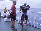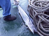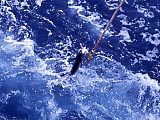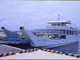 八重山観光のフェリー「かりゆし」。 | 海の日特集の取材で同乗していたNHK那覇のクルー。船上でも撮影していたのでワクワクしながら番組を見たら完全にカットされていた。 | 仲間と三線を弾きながら操縦する船長。のどかでいいなあ。 | 左舷船尾からトローリングをしていたら、みごとにかかった! | 80cmぐらいの鰆だった。 | 早速、船の台所(ちゃんとしたのがある!)で捌かれて乗船客に振る舞われた。刺身は獲れたてが旨いとは必ずしも限らないけど、これは抜群に旨かったね。歯ごたえがすごい! |