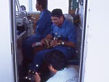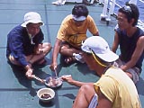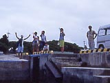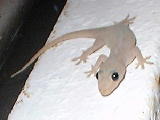 沖縄ではおなじみヤモリ君。 | これが噂の郵便船。え!? と思うほどの小ささ。基本的に平日は毎日運航するし、実際1,000円で便乗させてもらったが、この船を最初から交通手段として期待することは避けるべきと考える。 | 鳩間島で見送ってくれたみなさん。お世話になりました。台風の接近で郵便船が動くかどうか心配したが、何とか動いてくれた。うねりのある海だったが、思ったほどは揺れなかった。荒天の波照間便の方がよっぽど揺れる。 | これが船内。5人も乗ればキツキツ。もちろんこの他にたいてい大量の、みんなの荷物も積む。キャビンの外に置いておくとびしょ濡れになる。 | ←ここまで2001/07 | |