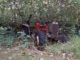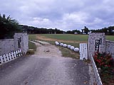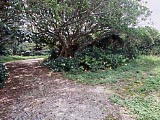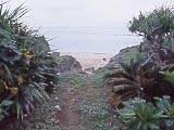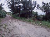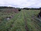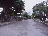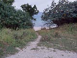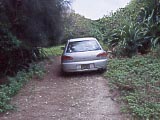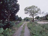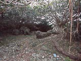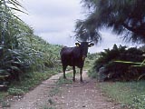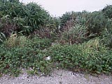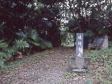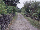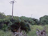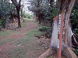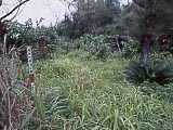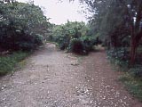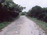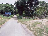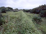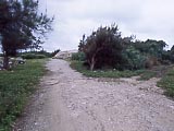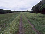 鳩間中森。 | 鳩間中森近くの道沿いで。 | まるだいの横の…、つまり鳩間港からまっすぐ上がってきた道を、さらに北へ進み、浜を目指す。この写真は鳩間中森や灯台への道を越え、牧草地に出てきた辺り。まだ、車のわだちが分かる。 | しかし、ものの2〜3分も歩くと草が鬱蒼と茂ってきて、道であることに不安が出てくる。ハブのいない鳩間島だからこそ短パンにサンダルで歩けるが、ハブのいる島ではとてもできることではない。なお、この草の中のあちこちに牛のウンコがあるので踏んづけないように注意する。女の子だとこの辺で心細くなってくると思う。 | 不安に駆られながらも、とにかく北を目指し、まるだいから約18分で一周道路に出る(写真の、横切っている道路。)。普段はこんな未舗装の細い道こそ心細くなるが、このときは何と広い道路に感じたことか!この道を右折して5mほどで左に島仲浜へ下りる道がある。 | |