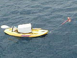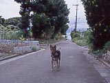 恋〜のぉ島、鳩間島ぁ〜。 | 鳩間港に入る前に、船が西表島方向に進んでるな、と思ったら、この持ち主不明のカヌーの捜索のためだった。後で知ったが、箱の中には伊勢エビがたんと入っていたものの、持ち主は行方不明だとさ。 | 星砂屋。まるだいのすぐ港寄り。 | 星砂屋の前の道にて。このワンコはまるだいの。道をずっと降りて行くと鳩間港ね。 | ||