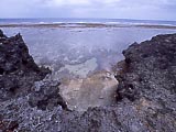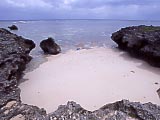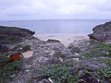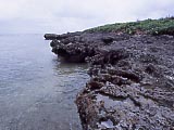 「島のマチヤー小」のある四つ角を左、つまり西へ曲がる。するとその道が一周道路になる。海の方へ延びている電柱を目印に草地を分け入っていくとビーチに出る。ただ、この辺りはまだ、鳩間港から浜沿いに歩いてきた方が分かりやすい。「島のマチヤー小」から徒歩(以降は全て徒歩の時間)約6分。 | 一周道路から屋良浜に通じる道。一周道路から既に海が見えるのですぐ分かる。鳩間島では1番分かりやすい浜に降りる道だと思う。電柱から約5分。 | 屋良浜 | 一周道路を屋良浜からさらに西へ向かう。 | 途中の道らしい草むらを抜けてきたら断崖に出た。大潮で大干潮のこの日でさえ、下には降りられなかった。屋良浜から約5分。 |
