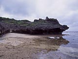 夫婦石。看板も何も出ていないので意識していないと通り過ぎてしまう。一周道路沿い。断崖から約2分。 | しばらくすると、道がちょっとが広くなる。来た方向を撮影。感覚としては、山道ですれ違いのための待避所があるような感じ。夫婦石から約2分。 | ←その場所から海側へ草を分け入っていくと、超ミニビーチがあった。 | また2分ほどで、目印になるかどうか分かんないけど、「八重山興業」の看板が落ちている。ここから海方向へ出ることもできる。 | 立原浜の入口。でっかい古タイヤが置いてある(というか、捨ててある。)が目印。看板から約2分。 | 小さなビーチの立原浜。 |