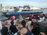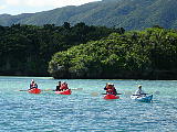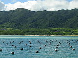 また台風だよ。 | 空港で客にパインジュースを振る舞っていた。後ろのガラスには「ご迷惑をおかけしています」と貼ってあるが、迷惑をかけてるのは台風なのに…。 | 離島桟橋待合い所のテントも台風に備えて丸められていた。 | 川平湾を海から撮影。 | カヌー教室の一行。 | 黒真珠の養殖場。川平湾内で潜るときは一応連絡をするルールになっているらしい。海は誰のものでもないが、まあトラブル(潜って真珠を盗るとでも思われているのか。)を避けるためということか。 |