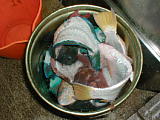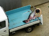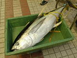 離島桟橋での港まつり。「はいむるぶし」のデッキでバンドが演奏していた。屋台も数店出てみんなオリオンを呑んだりいろいろ喰ってたよ。 | サトちゃんと飛ぼう! | やった〜!3本も当たったゾ。「50円物」ってのがいいね。 | 市場の片隅に捨てられていたイラブチャーなどのアラ。おばーに「持ってけ」って言われたけど、内地に帰る日だったんでもらわなかった。そうでなければもらってって煮付けでも作るんだけどなー。もったいなかった。 | 1m級のマグロ! | 台風が来てる中 、軽トラの荷台でマグロを捌いていた。 |