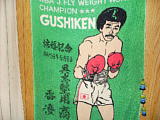 民宿あさど屋の奥の部屋にピンで貼ってあった具志堅用高さんの結婚記念のタオル。大爆笑! | ||