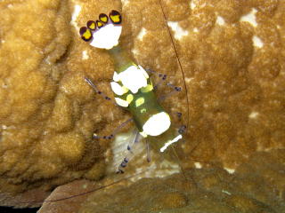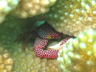 オオアカホシサンゴガニが サンゴの陰からコソッとこっちを 睨んでいる(笑)。 |