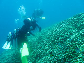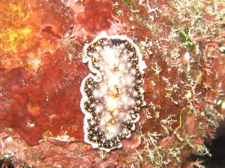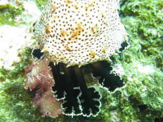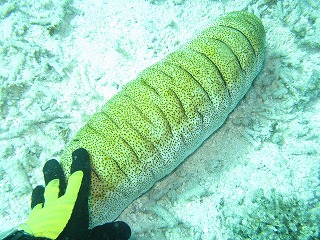 1本目を開始してすぐにいたナマコ。 フランスパンみたいでしょ。 大きさが分かるように 俺の左手を添えている。 コイツを持ち上げたりひっくり返して 寄生しているエビを探したりして、 こねくり回す。 |