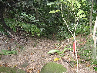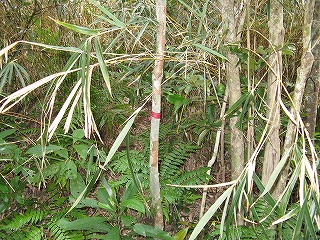 柵を過ぎて、ケモノ道を進むが、 割と頻繁に、写真右端に写っている ような赤い目印が木などに付いている ので、それほど不安はない。 |