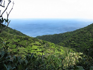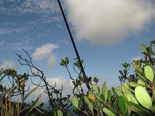 (自生地であることに気付かず) 荒川を越えて進むと、 ケモノ道がぐっと細くなり 赤い目印もあまり出てこなくなって かなり心細い状態だ。 風は強いものの天気は晴れで、 結構暑い。 既にTシャツとタオルマフラーは汗だくだ。 そんなとき、ふと海が見えた。 うわ〜、こんな高いとこまで来てんのか。 |