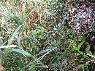 ケモノ道が、いよいよ草に覆われて かき分けながらでないと 進めなくなってきた。 これはいくら何でもヘンだゾ。 嘉門達夫さんの「ゆけ!ゆけ!川口浩」 のフレーズが思わず出てくる…。 |