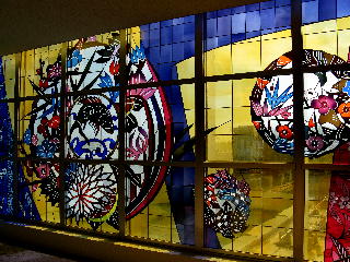 洗濯と乾燥が終わって 石垣空港でレンタカーを返し、 早めに搭乗口に行っておき、 待合室のベンチでこのページを作る。 この写真は、先月遠目に撮影した、 空港のステンドグラス。 きれいだね〜。 |