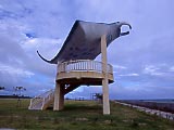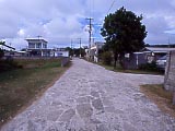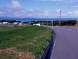 40km/h制限の砂利道。 | 小浜島の西の端、細崎へ一本道。 | マンタのオブジェが乗った展望台。 | 家の壁に描かれていた。海人かな? | 細崎の集落内。 | ヨナラ水道。向こうの島は西表島 |