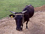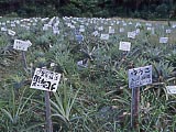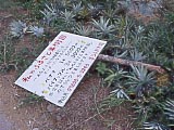 港の近くにある、「小浜島観光案内センター」。 | ←の隣にある、「小浜島総合案内所」。レンタカーやレンタバイクもやっている。 | 港にいた「船券売車」。 | うふだき荘の「ふるさと果樹園」。植えた人の名前などが書かれたプレートが立てられている。 | 「ふるさと果樹園」の看板。折れて倒れていた。 | 牛の中にいた、烏骨鶏? |