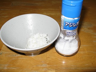 最後に米が残ったので、 不本意ながら「アジシオ」をかけて喰う。 |