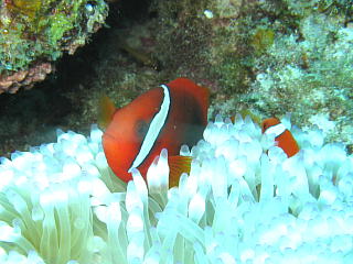 白化したサンゴでゆらゆらしていた ハマクマノミ。 |