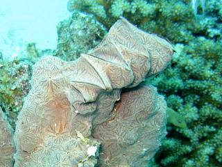 サンゴと一体化してしまった トサカガキ。 それにしても、なんでこんなに 凶悪的な口のデザインかね〜。 |