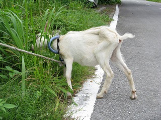 宿のヒージャー(yg)が 朝から元気よく草を食んでいる。 |