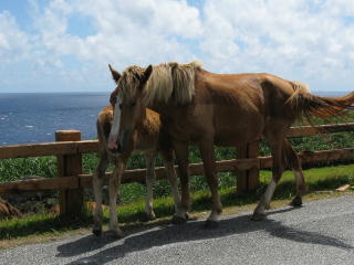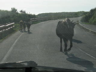 島の南側の道路を走っていると、 牛や馬によく出会う。 こっちが何もしないと向こうも何もしない。 道路には「落とし物」がたくさんあるので、 気にする人は気を付けてね(笑)。 |