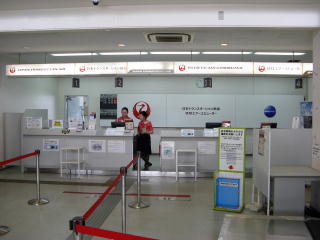 与那国空港外観 | 出発カウンター。 今はRACだけなのに、 まだJTAのロゴが残っている。 |