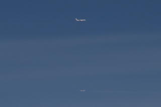 同方向に飛んでいる機がいるな〜 と思っていたら、 その間をJAL系と思われる対向機が 一瞬ですれ違った。 なんせスピードが高い飛行機の すれ違いを撮ろうと狙っているので、 見逃さないように常にカメラを手にして いないといけない。 他の乗客からすると「ヘンなヤツ」 に見られているに違いない。 |
