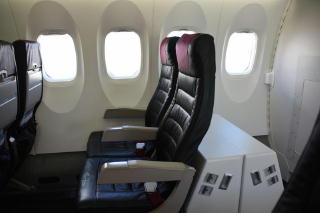 この機は2016年製の新車(新機?)。 シートは本革製。 こんな(失礼)ちっちゃな機でも、 シートピッチはピーチ機よりずっと広い。 |