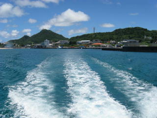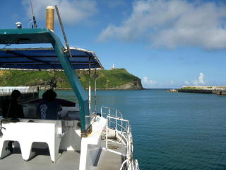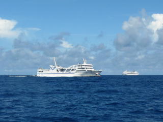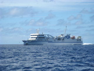 1本目の出航とほぼ同時に、 ダイビングボートと同じ港に停まっていた 「フェリーよなくに」(「ぐ」は濁らない。)も 石垣島に向けて出港した。 右は、台湾の基隆港からやってきた クルーズ船。石垣港に向かっている。 |