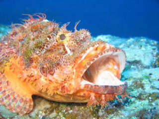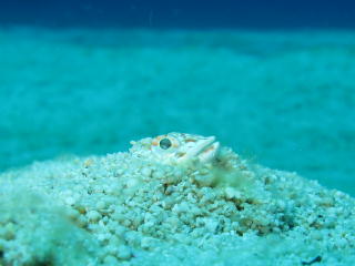 今日ラストの3本目は、 島の西すぐの西崎で大物狙い。 海は、不気味なほど穏やかだ。 白波1つ立たないもんね。 でも、空はだんだん雲が増えてきた。 -25mほどの大きな根(=岩)に掴まって、 サメなどの大物を見ている間に、 目の前に歩くようにやってきたオニカサゴ。 ホントに目の前にいて、 カメラを構えても逃げない (魚はカメラを構えるとたいていは 本能的に逃げる。)から、 とっ捕まえて空揚げにでもしてやろうか と思いたくなる。 |