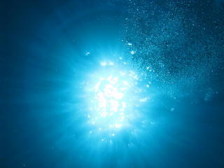 砂地の水深約-15mから見上げる。 吐いたエアーがてぃだに向かって行く。 |
