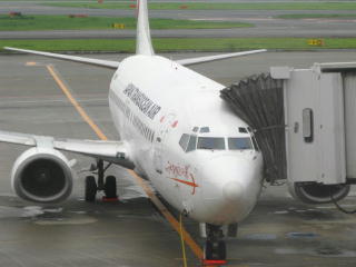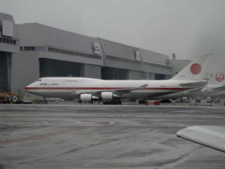 タクシー(移動)中に、 政府専用機を見つけて、慌てて撮った。 この機が外国に着いたときなどに、 機上に国旗を掲げるのが 「ハタ坊」みたいでちょっと情けない と思うのは、俺だけだろうか。 |