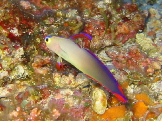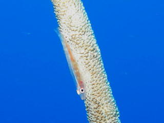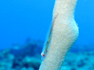 1本目は深場のポイントで、 アケボノハゼを見た。 とてもきれいな魚だが、 近付くとすぐに引っ込む。 いったん引っ込むと すぐには出てきてくれないので、 そのときはあきらめるしかない。 せっかく深場まで行って すぐ引っ込ませてしまっては残念だが、 今回のダイバーは みんな魚への近付き方がうまく、 最後に撮影した俺の時まで 引っ込まずにいてくれた。 IXY DIGITAL200a(有効200万画素) &WP-DC600のセットで撮ったもの。 なかなかうまくいったね (トリミングはしてるよ。)。 約-48mにて。 |