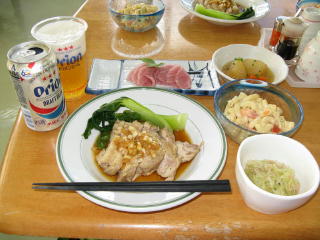 晩メシ。 蒸し鶏など。 酒のツマミになるものが多い。 今日は、バショウカジキの刺身が付いた。 海人から差し入れがあったらしい。 内地でカジキっていうと 身が柔らかいイメージがあるが、 獲れたては身が締まっていて しっかり噛み応えがあるのだ。 旨い旨い! メシの後は、画像を整理したり、 明日の準備をしたりして、 1日目が終わっていった。 |