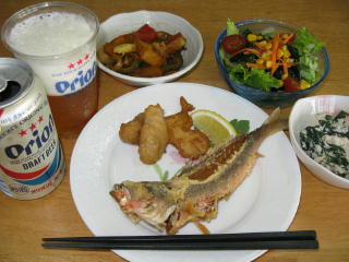 晩メシ。 グルクンの空揚げは骨まで喰ったよ。 |