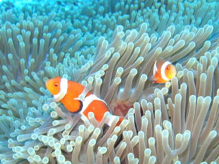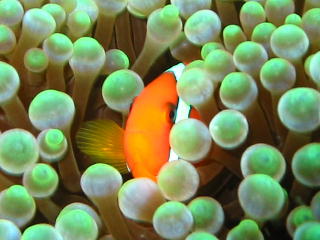 PowerShot A20&WP-DC200 で撮影したハマクマノミ。 トリミングはしている。 カメラは有効200万画素で、 現在のレベルから見ると 随分少ないが、まだまだ しっかりした写真が撮れる。 |
