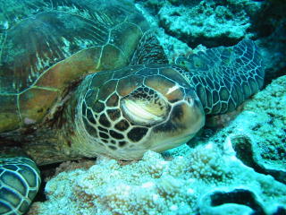 ウミガメくん(さん?)もいた。 IXY DIGITAL 400&WP-DC800で 撮影したが、ストロボが発光しなかった。 ダイビング後にカメラを改めて チェックしたが、やっぱりダメだった。 事前に内地で確認したときは 発光していたと思ったけどな〜。 ま、その辺がジャンクだね。 俺はこういうのを楽しめるから大丈夫。 |